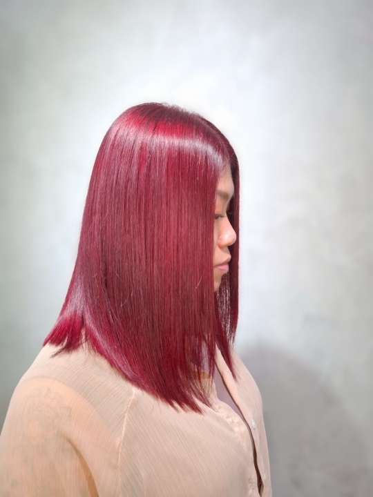 經典的中長直髮,搭配齊長或微層次的髮尾,線條非常俐落,加上亮眼的莓果紅色,在室內光下會帶有一點深沉感,但在陽光下則會顯得更加飽滿和鮮豔。很能展現髮色的光澤感。