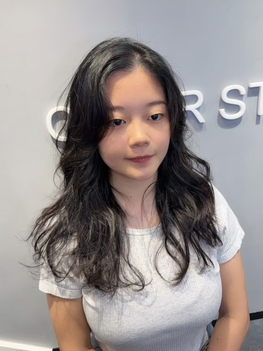 「中高層次的剪裁」加上「自然的水波紋捲」,既能修飾臉型,又很好整理。