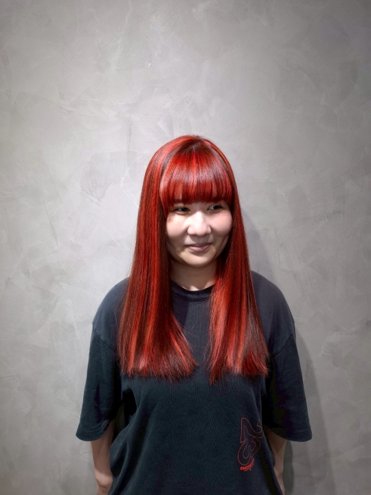 髮型需要漂髮,要達到這種鮮豔的紅色,通常需要先將頭髮漂淺至七度或八度,才能讓紅色染劑顯色。頭髮越淺,紅色會越明亮。