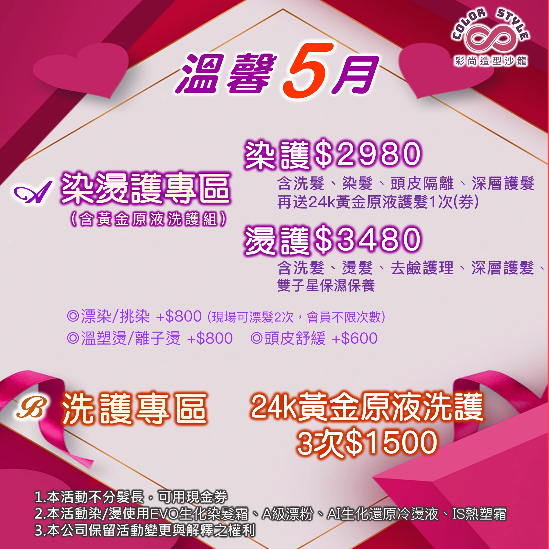 詢問度超高的黃金洗護組,只要5月染燙護,都可以享有一組帶回家。