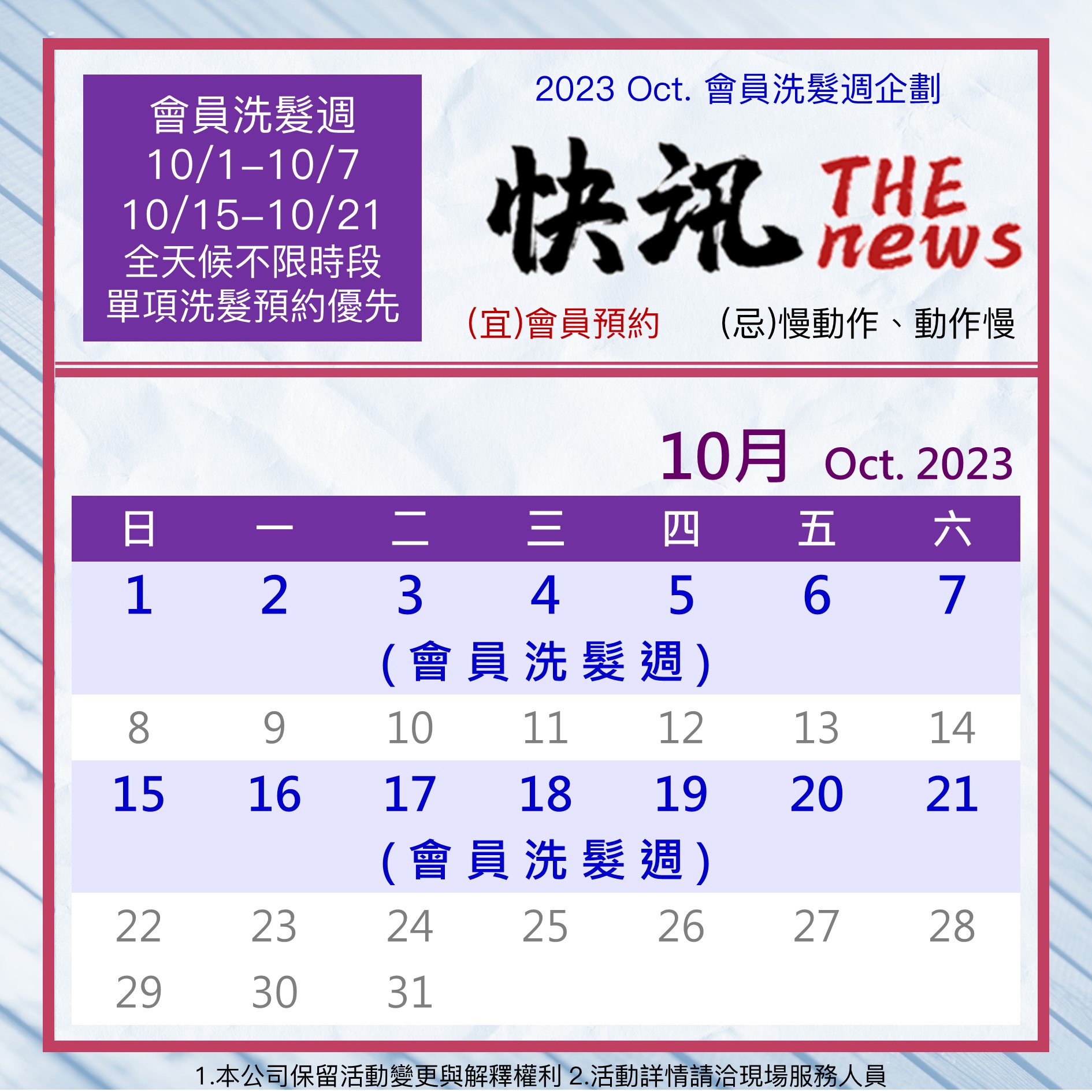 10月會員洗髮週:10/1-10/7、10/15-10/21