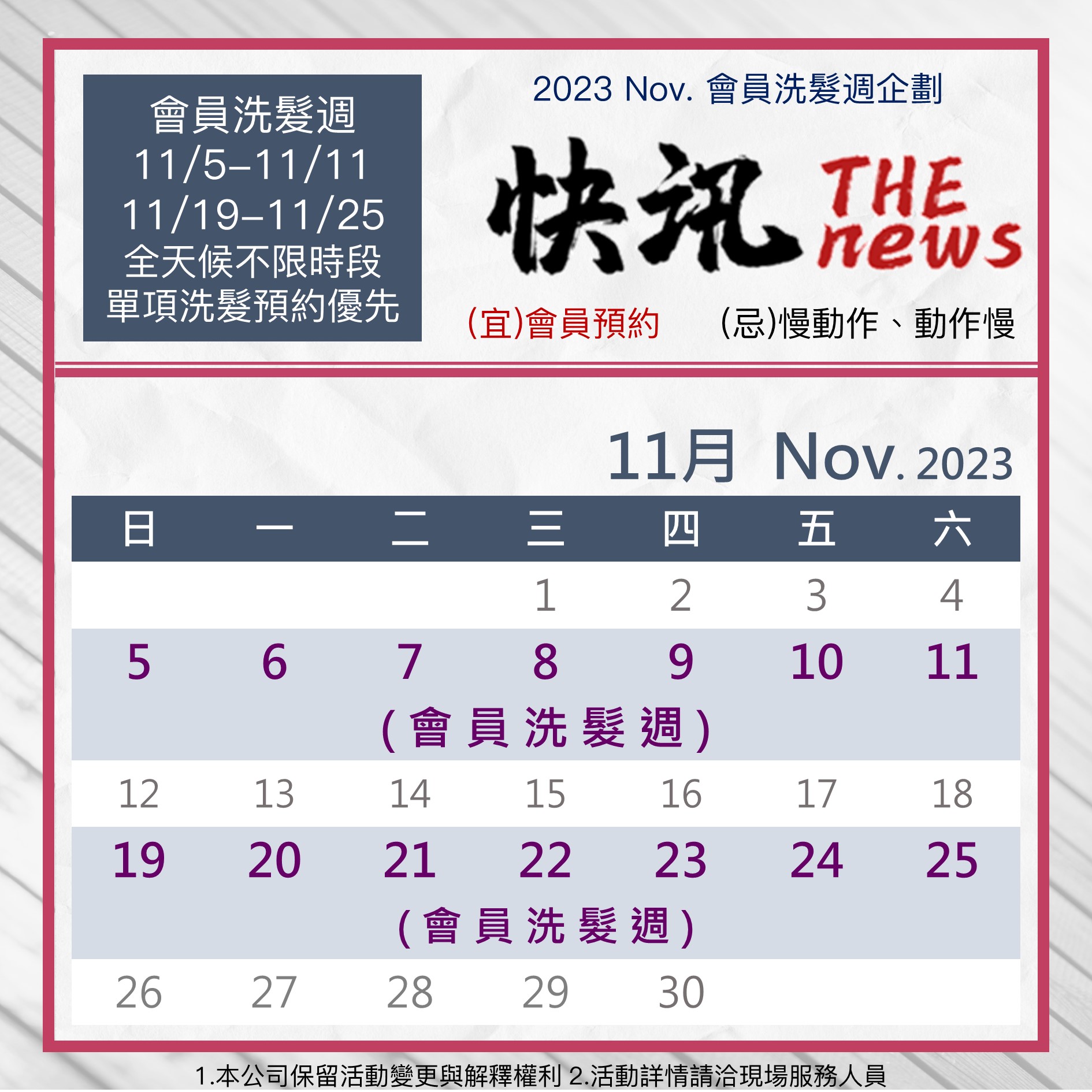 2023.10.25 11月會員洗髮週:11/5~11/11、11/19~11/25 11月會員洗髮週 全天候不限時段、不分平假日,會員單項洗髮預約均享優先服務。 點擊官方LINE 加好友,立即享有線上預約服務☛☛☛https://lin.ee/0OUCkic