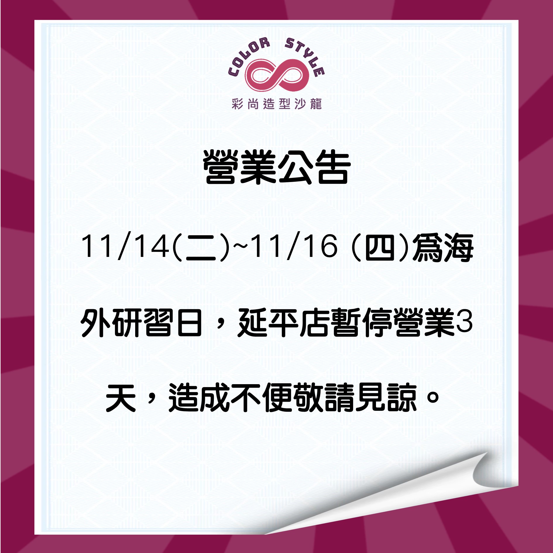 11/14-11/16 海外研習日,【延平店】暫停營業3天。