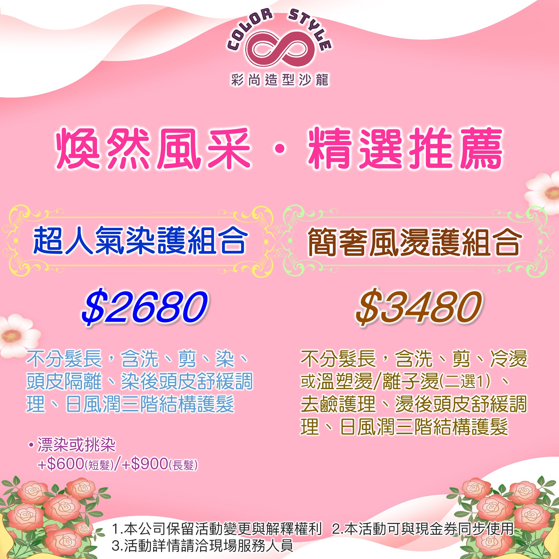 2024.05.01 精選推薦 超人氣 vs 簡奢風 精選 超人氣染護 vs 簡奢風燙護 組合 不管哪一種,全部不分長短均一價。 均含洗、剪、護、頭皮舒緩,以及染/燙專用護理, 不用再因為 選擇性障礙 感到苦惱囉~